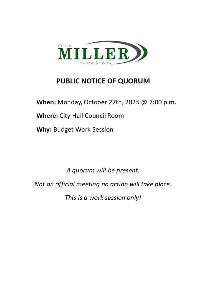Welcome to the City of Miller, a proud and progressive agricultural community nestled in central South Dakota. Whether you’re visiting for the first time or have called Miller home for years, we hope you’ll find valuable information and resources on our website. Rich in tradition, Miller and its surrounding areas offer a wealth of opportunities for both residents and visitors alike. From our storied history rooted in the arrival of the railroad in the 1880s to our vibrant community today, Miller has continually evolved while honoring its past. Join us in discovering all that Miller has to offer!